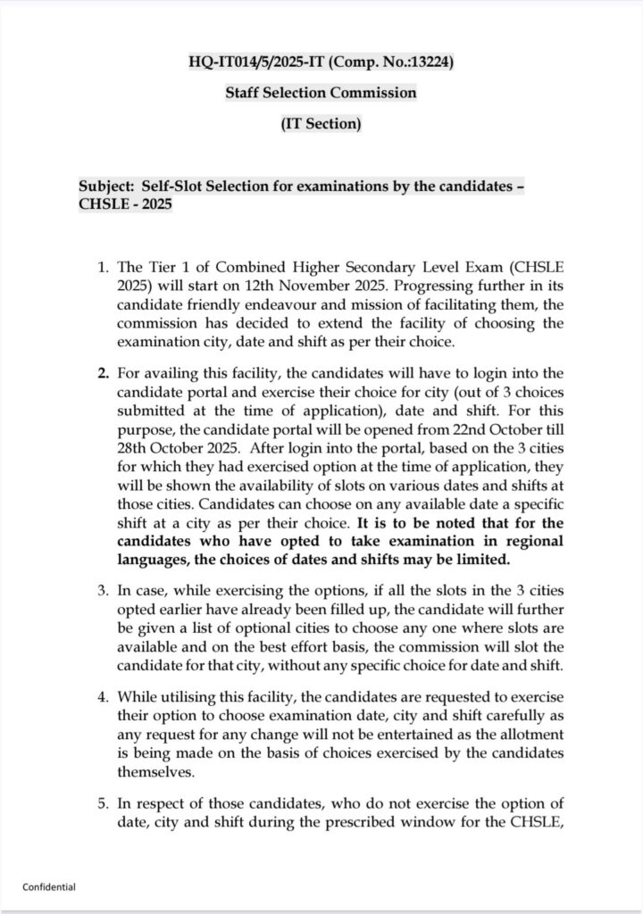 For the first time in SSC CHSL history, aspirants can select their preferred exam city, date, and shift. The self-slot selection facility will be available on the candidate portal from 22nd to 28th October 2025. Candidates can choose from the three cities selected during registration. If slots in those cities are full, other available cities will be offered.